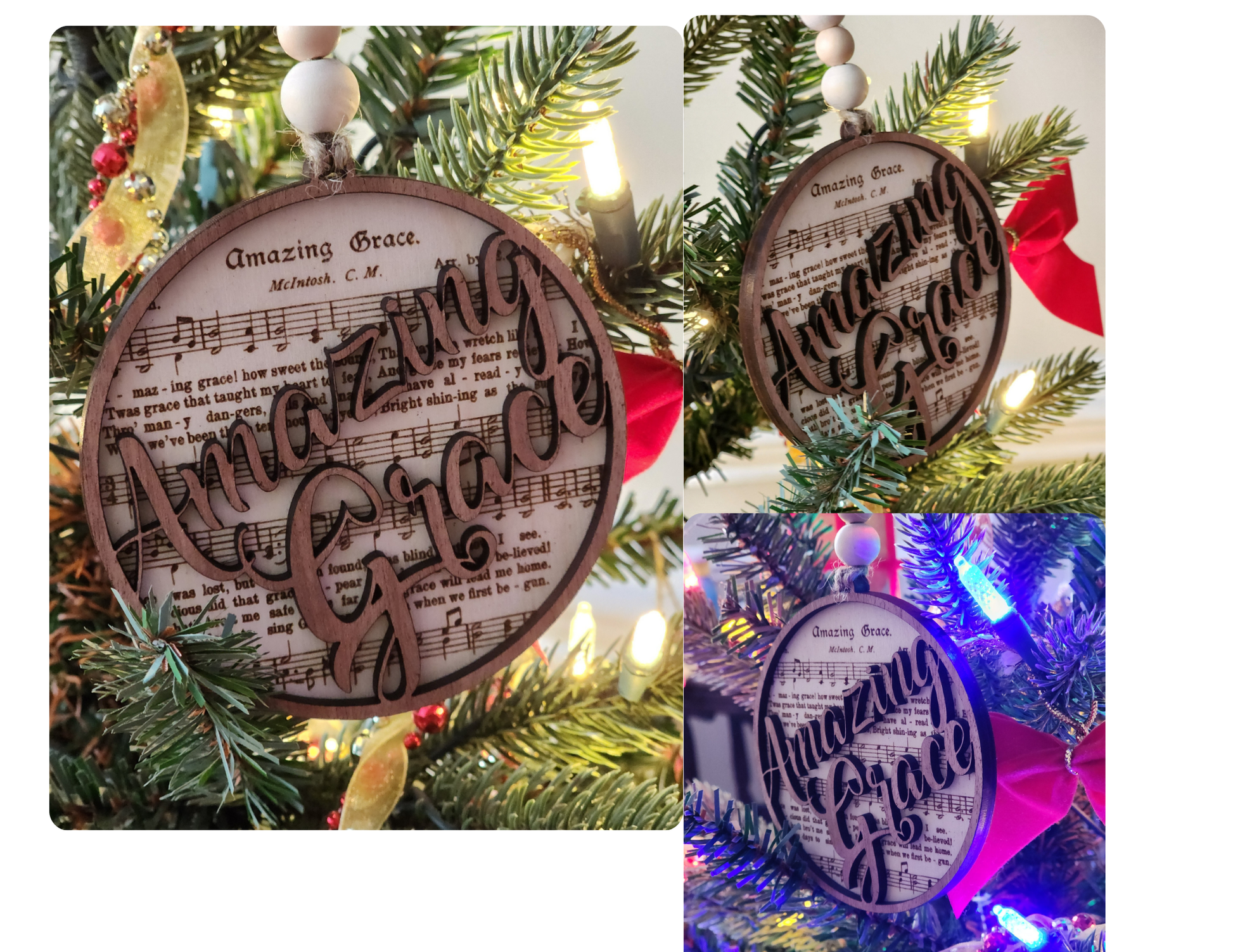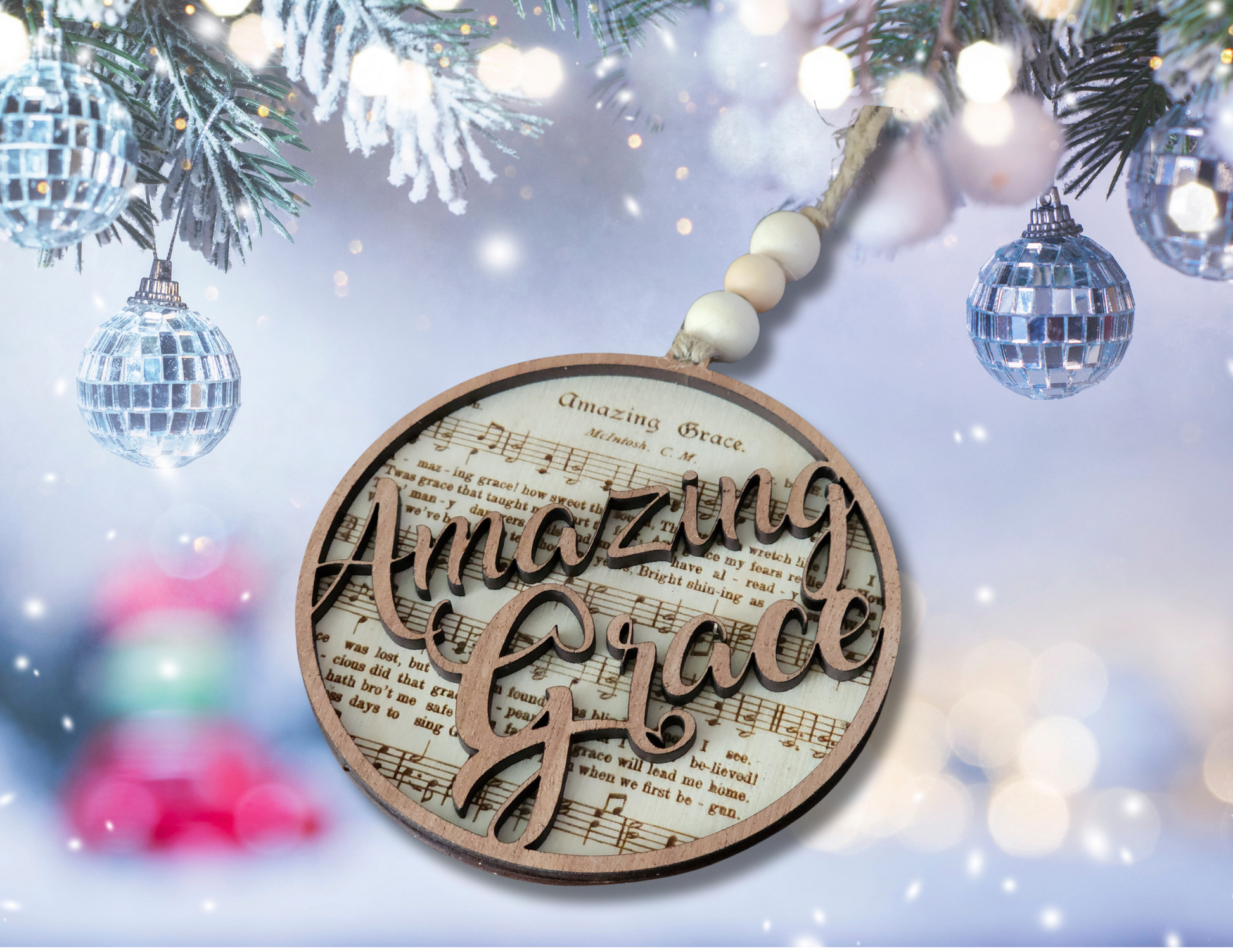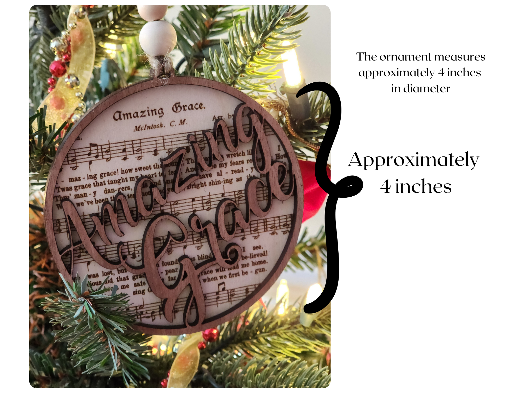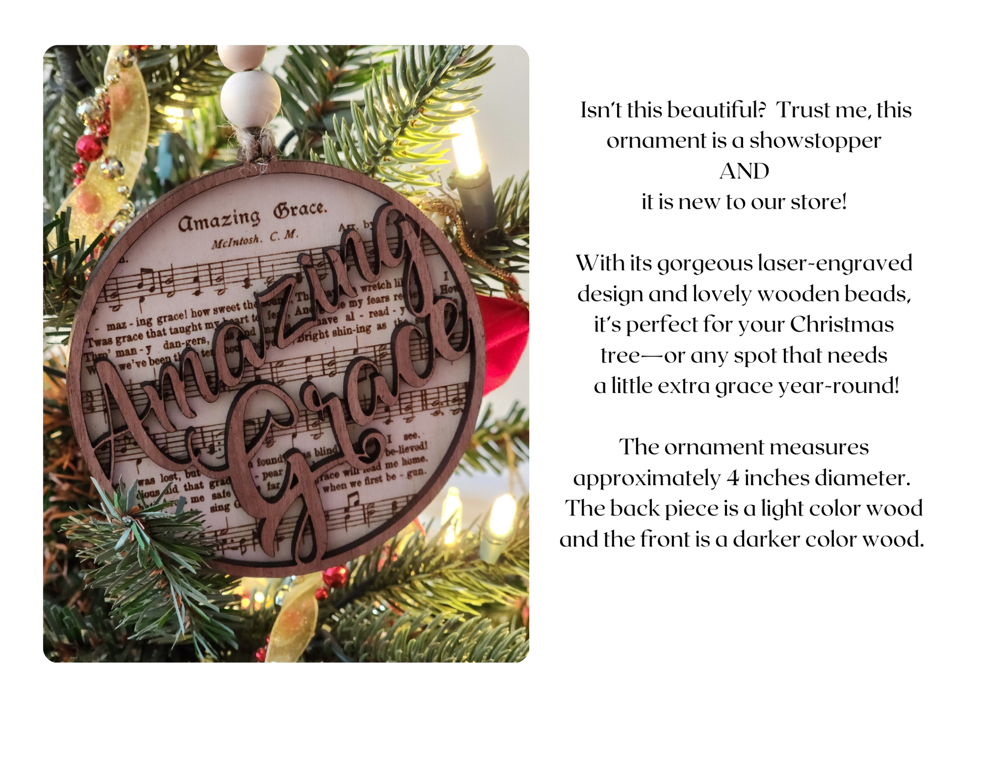 Celebrate the joyous spirit of Christmas with our Amazing Grace Christmas Ornament! This beautiful 4-inch ornament is designed with a light-colored wood back, intricately engraved with the heartfelt words and music of "Amazing Grace." The top layer, crafted from a darker wood, elegantly displays the song's title, adding a touch of rustic charm and reverence to your holiday décor. The natural color beads and jute string complete the rustic look.