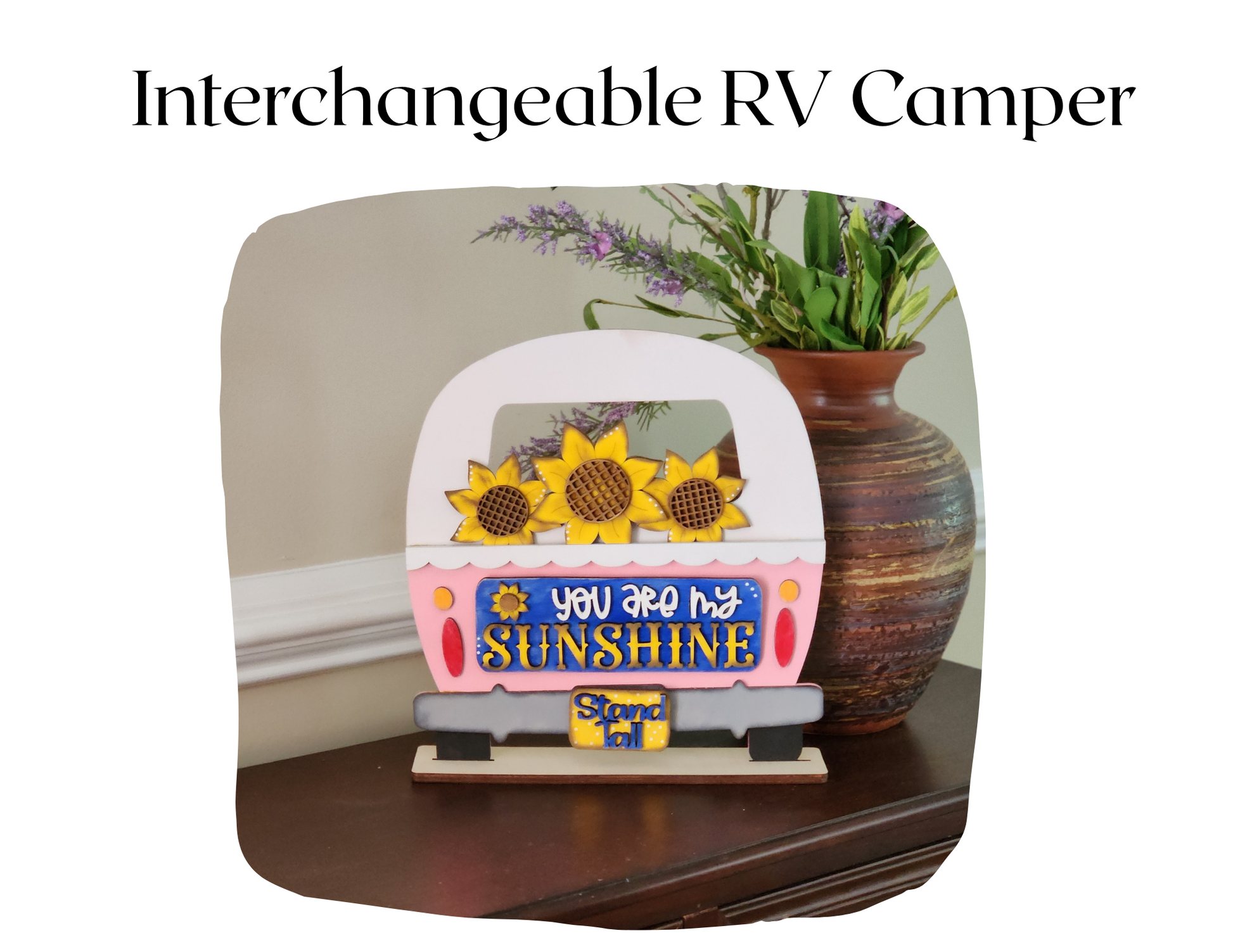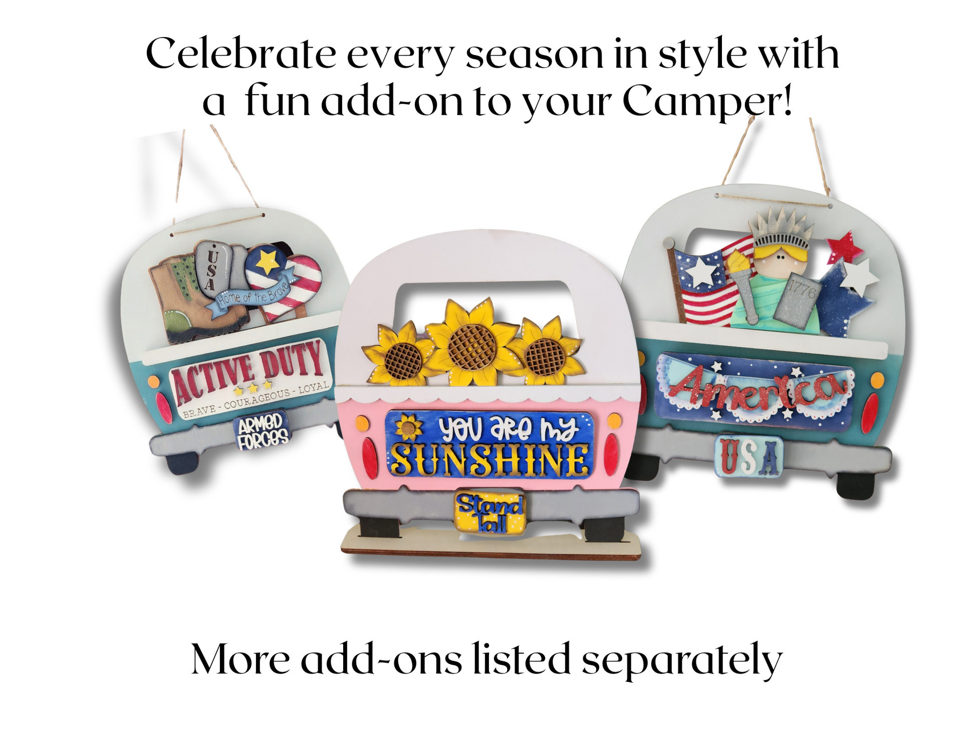Bring charm, color, and creativity to your home with our Interchangeable Camper—the perfect blend of function and fun! Measuring approximately 15" high by 10.5" wide, this hand-painted wooden camper is a versatile decor piece designed to hold any of our seasonal or holiday add-ons (sold separately). With a white top and your choice of bottom color (listed below), you can match it to your style and space.
