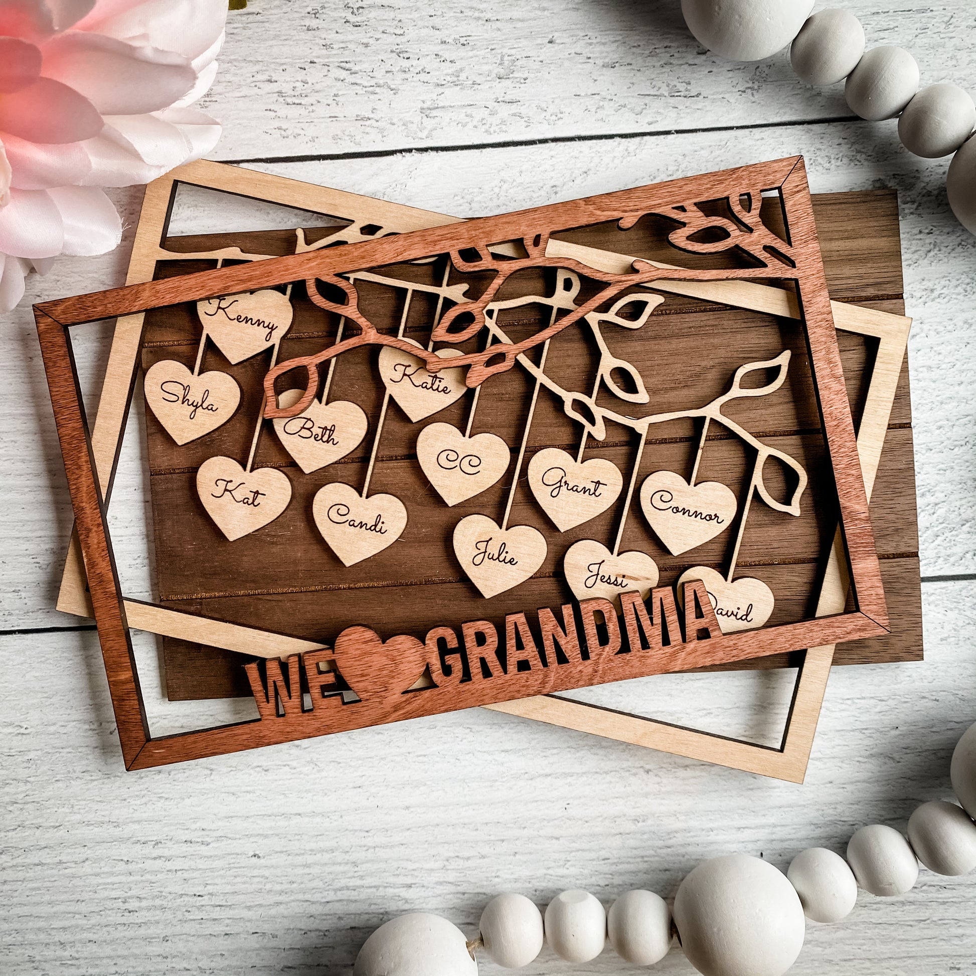 Signs are created with dark-colored wood on the front and back with light-colored wood in middle with names of your kids and grandkids engraved on them. **Please note the frame size that corresponds with the number of names***