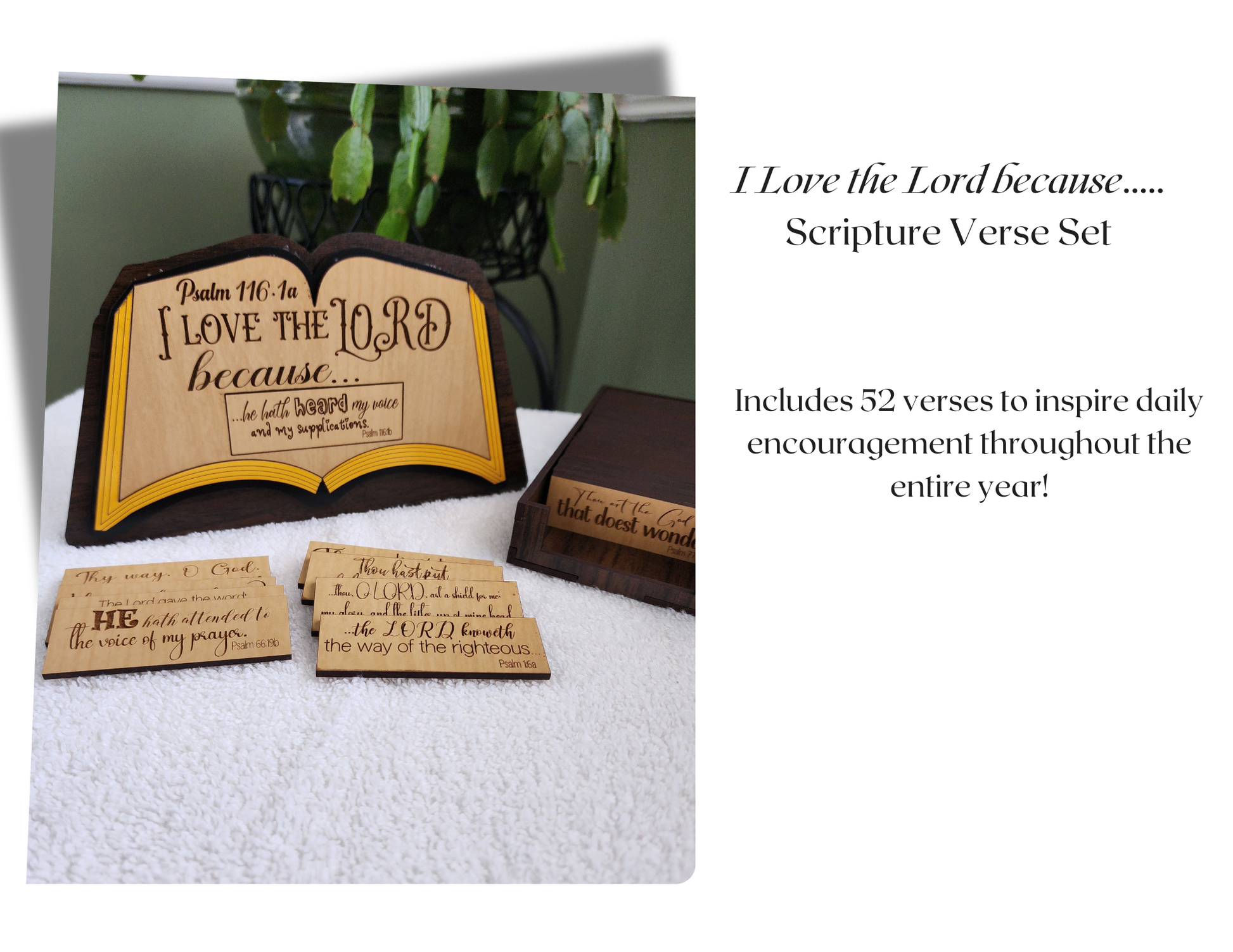 Fill your heart with weekly encouragement through this beautifully crafted 52-verse “I Love the Lord because…” Scripture set! Each verse is a reminder of why we love the Lord, taken straight from the King James Bible. Display a new verse each week and let God’s Word inspire you every day!