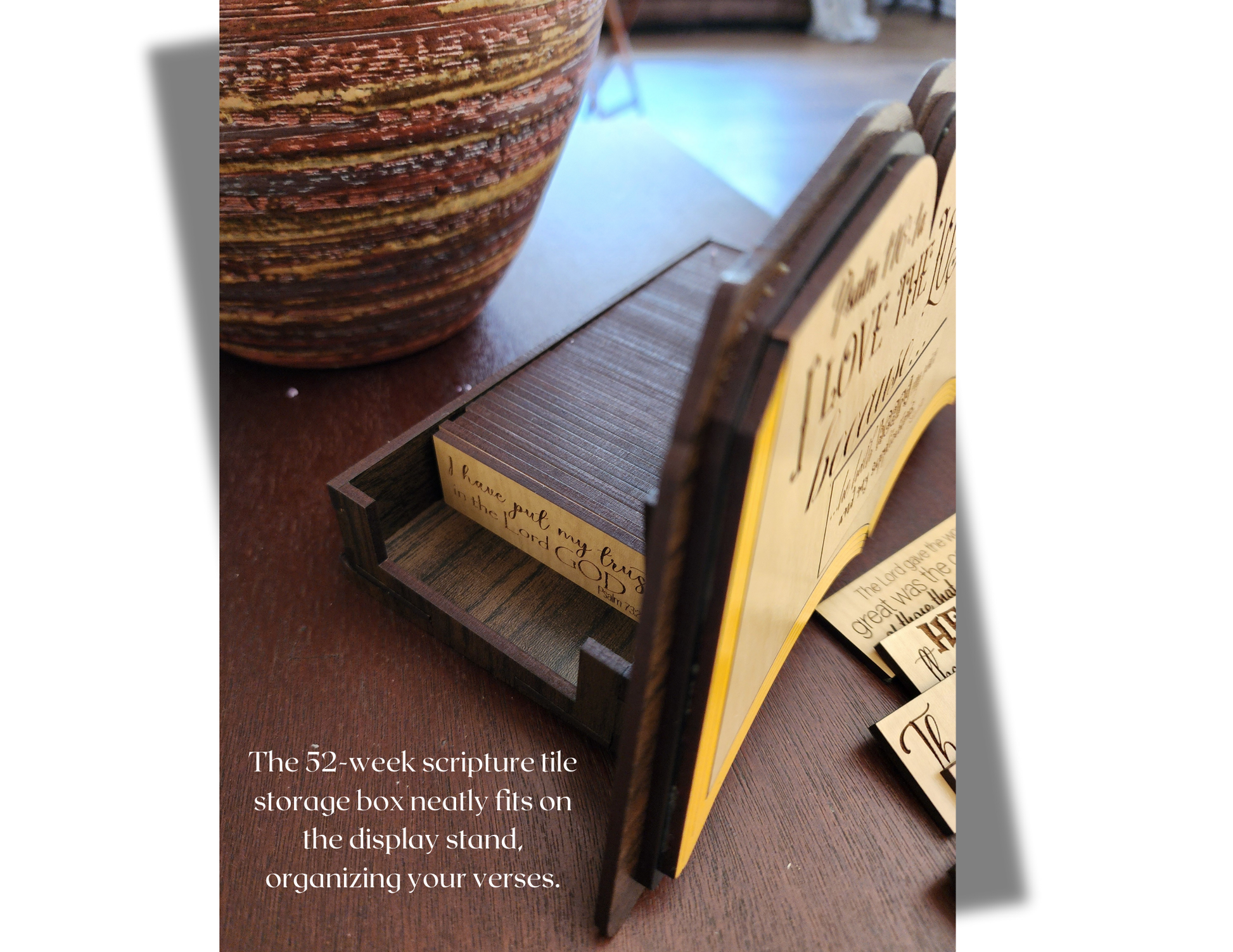 Compact Storage Box – Keeps your verses neat and fits perfectly on the stand at the back of the display.