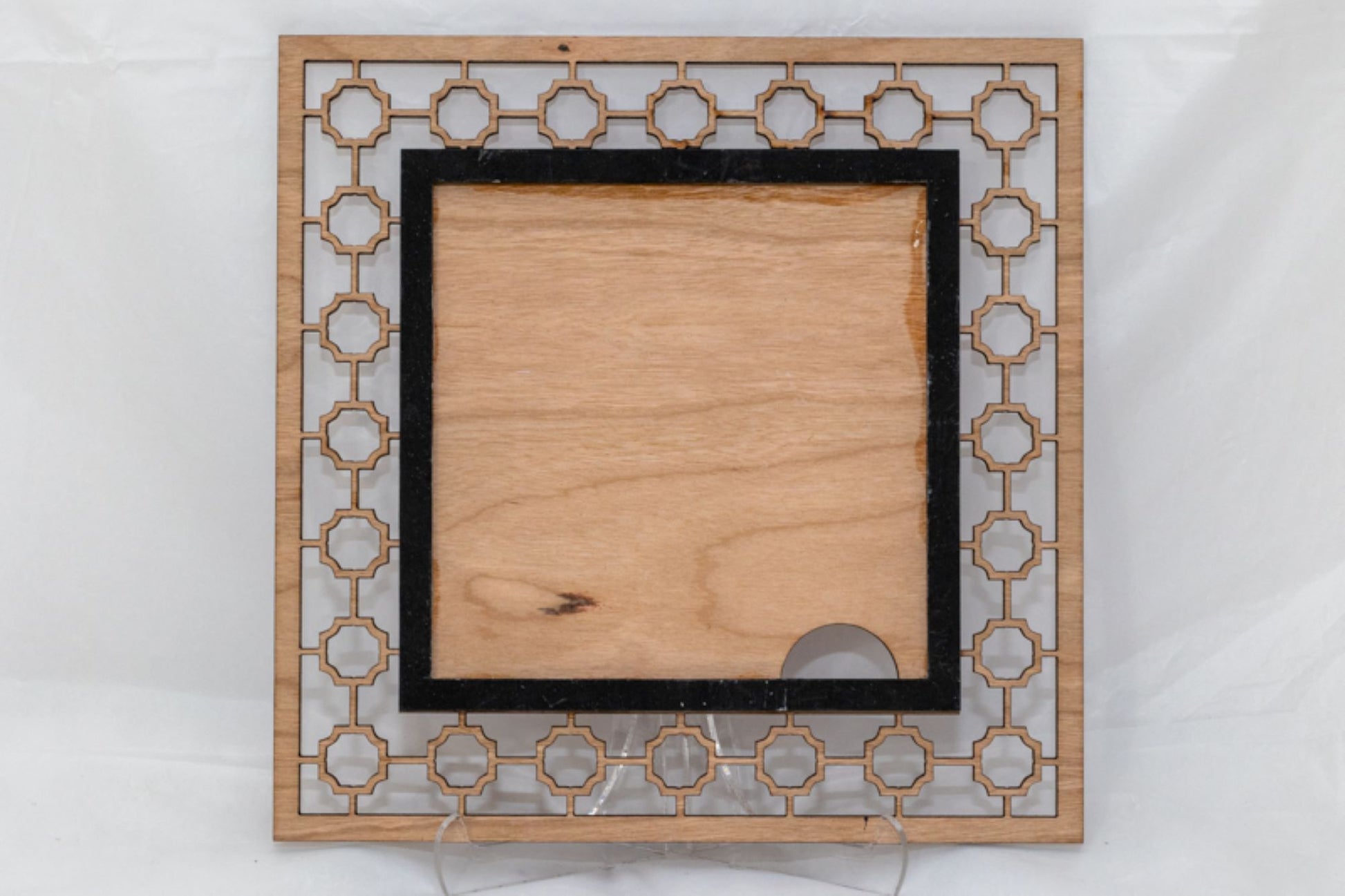 Frame is laser cut, so there may be charring around the edges. There may also be a smoky smell when it arrives. That is normal and will lessen over time.