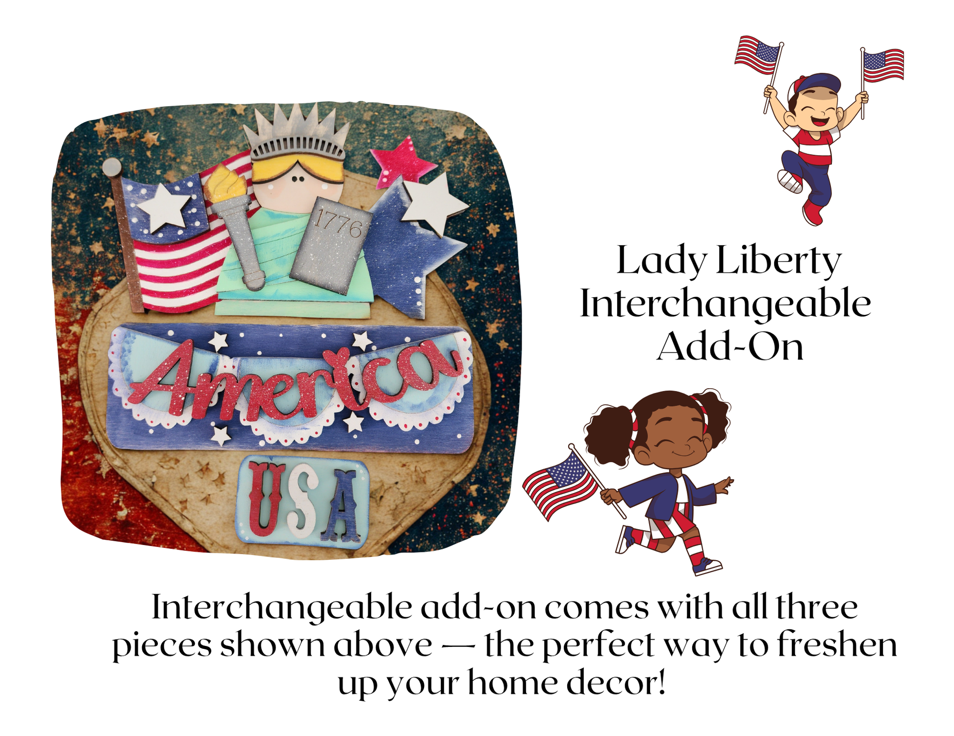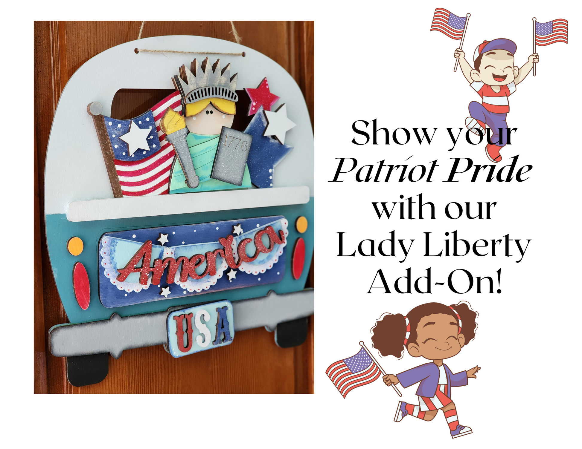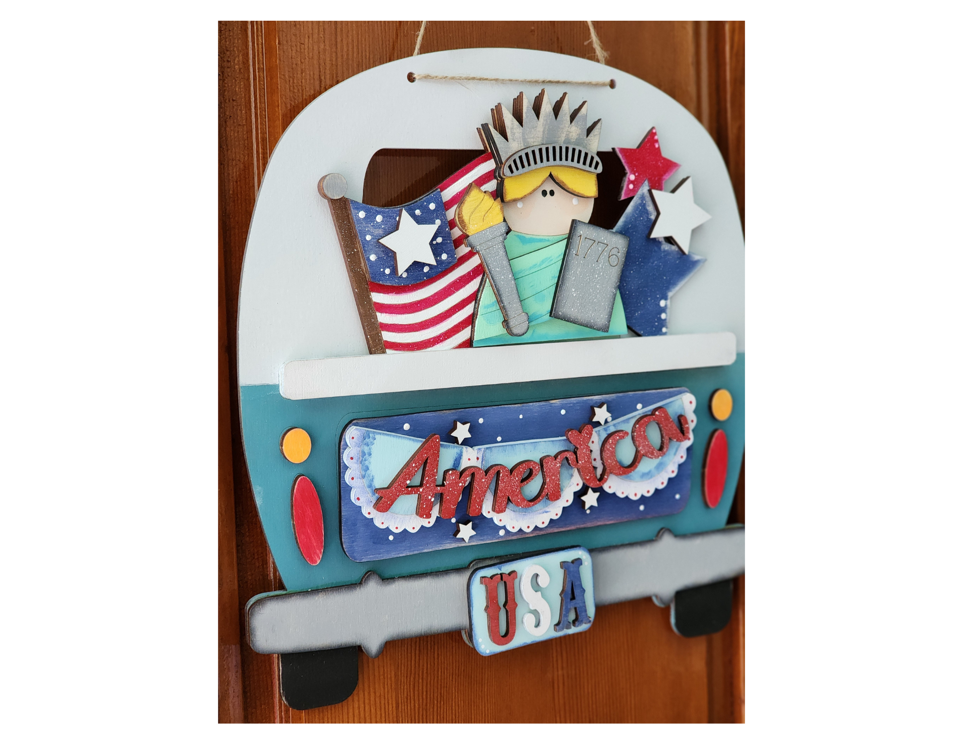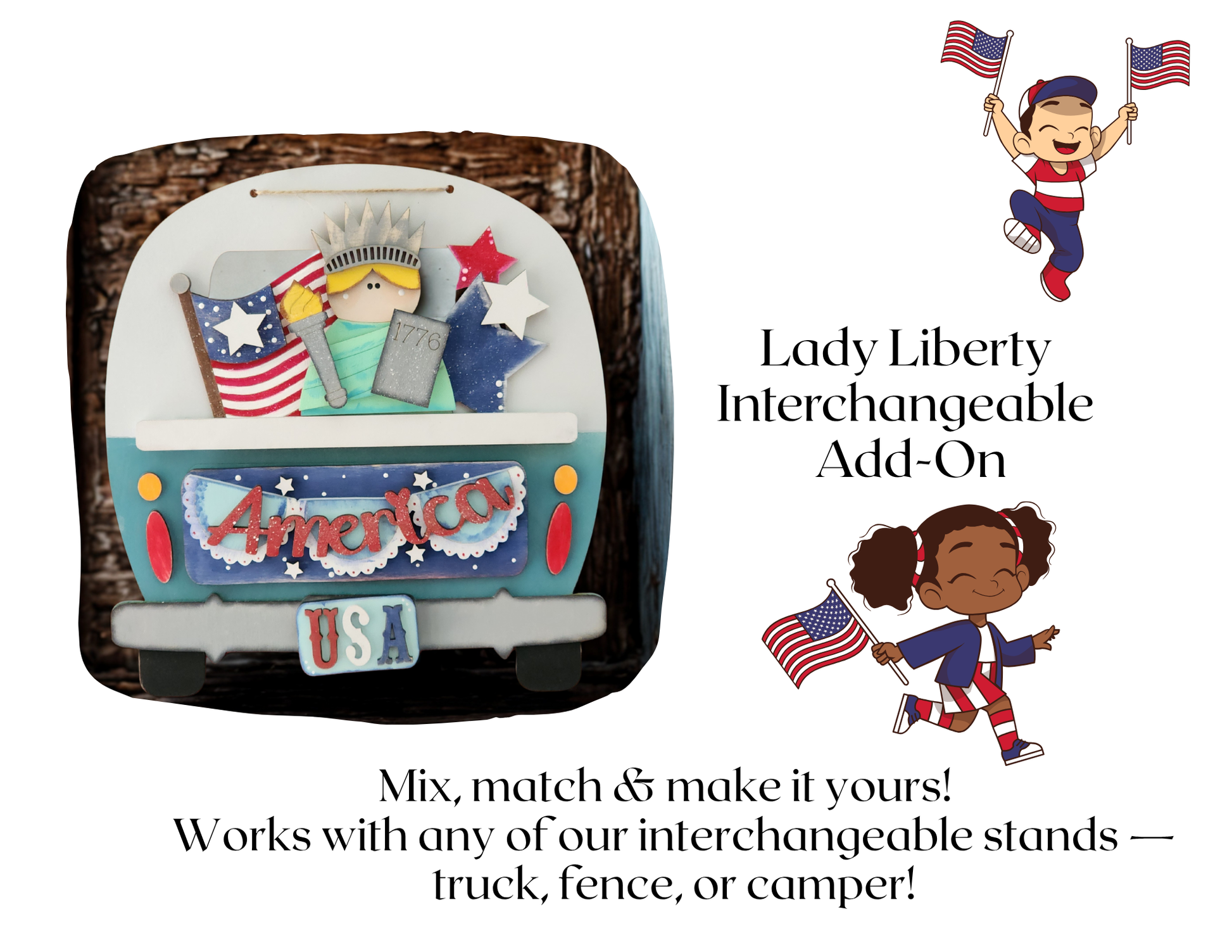 Celebrate America with this bold red, white, and blue 3-piece hand-painted set! Featuring Lady Liberty, a bold USA “license plate”, and an “America” banner, this patriotic add-on fits perfectly in your interchangeable truck, fence, or camper (sold separately). A beautiful way to remember the freedom we cherish—this set is ideal for Memorial Day, the 4th of July, or year-round celebration. TRUCK, FENCE OR CAMPER SOLD SEPERATELY.