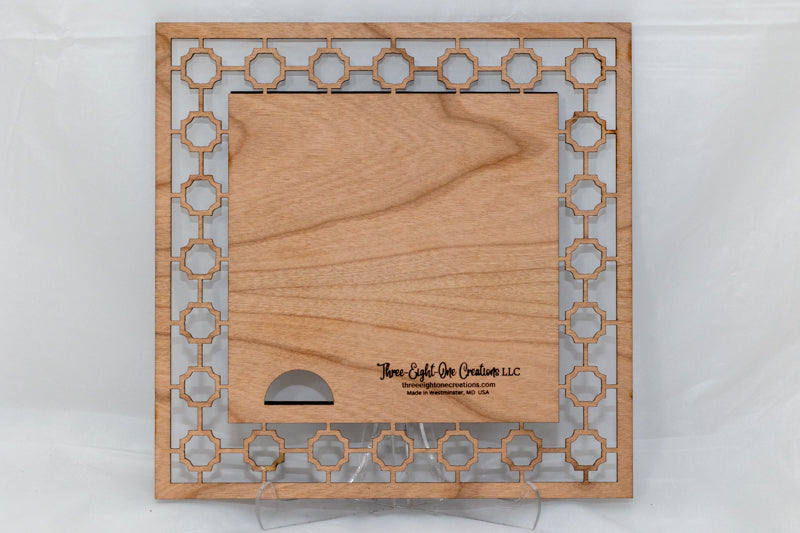 The individual frame is laser cut in a medium color wood with a black frame around the insert.