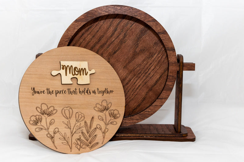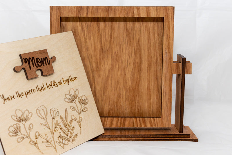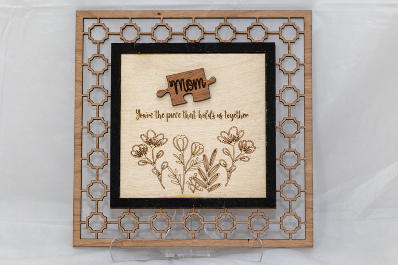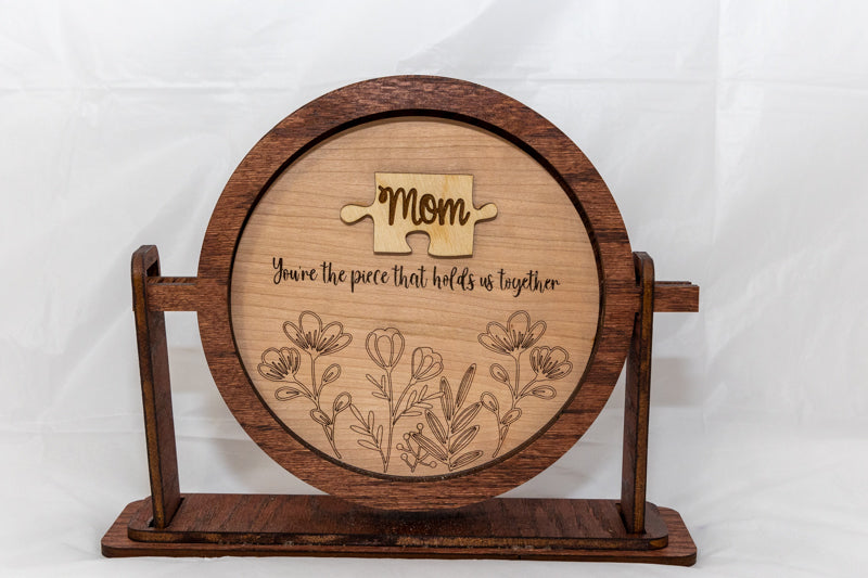 Brighten mom’s day with this interchangeable “Piece to our Puzzle” family sign. This sign fits in a round or square interchangeable mantle frame or leaning frame which are sold separately. Signs can be ordered in 6.15 inches squared, 4.25 inches squared or 6.05 inches diameter depending on the size interchangeable frame you are using. It is done in a medium-colored wood with the designed engraved into it.