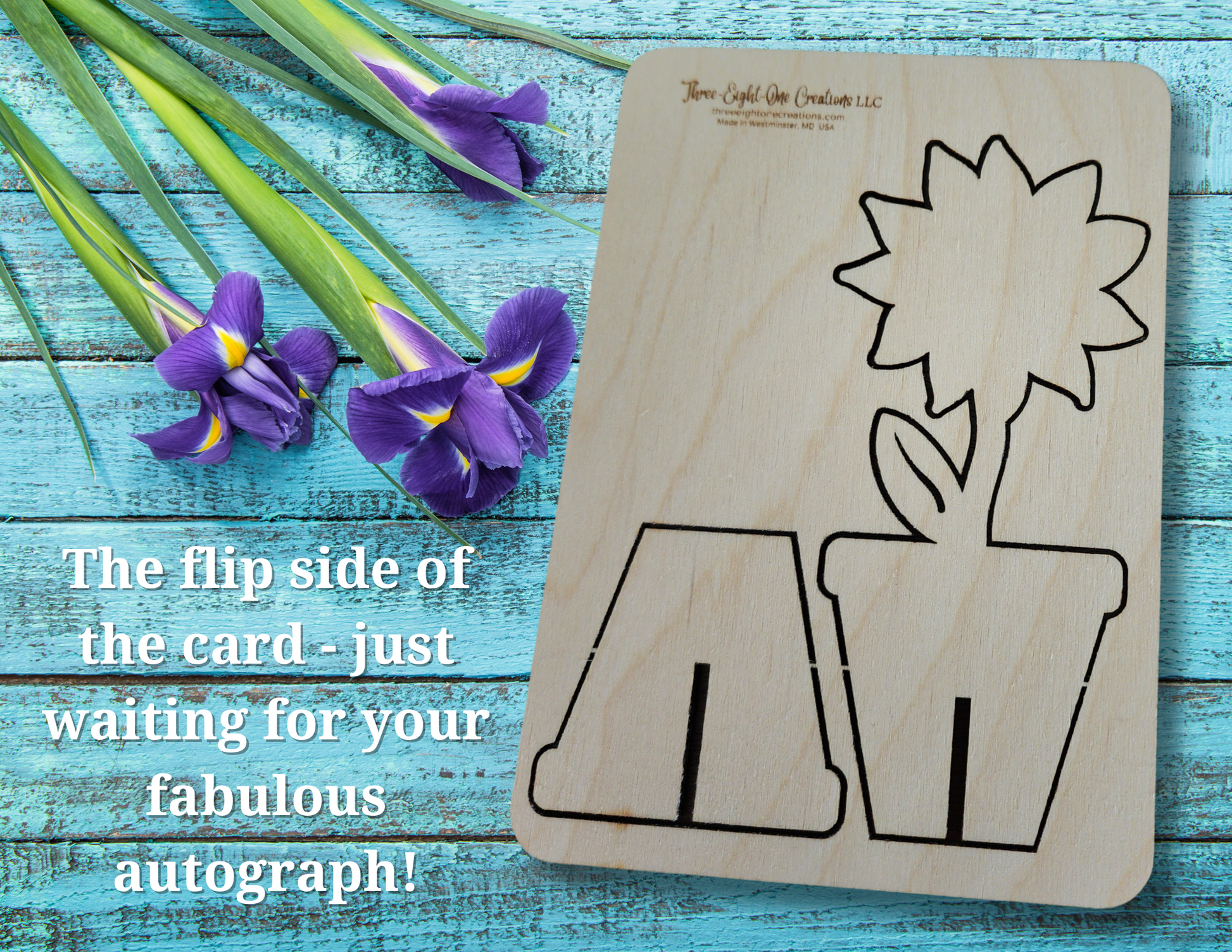 Card is made of light colored wood and the flower is designed to “punch out” and set up beside the card. 1 set of paint is included with the card.