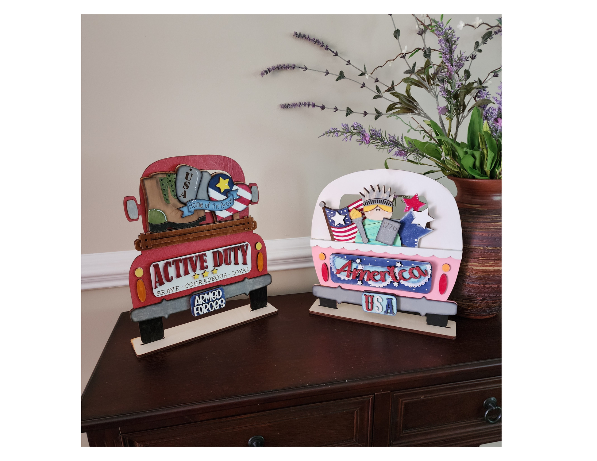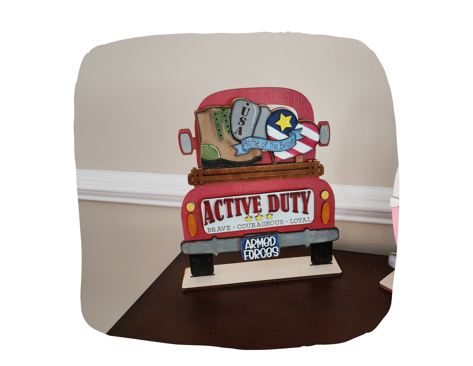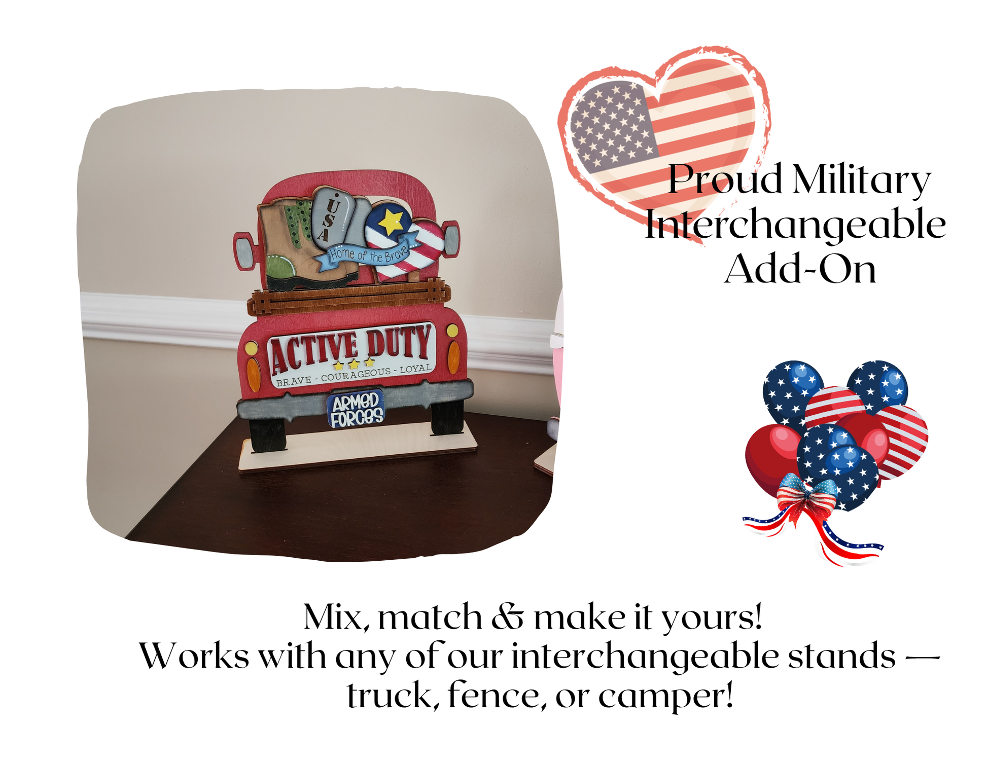 Honor those who serve with this hand-painted Proud Military Add-On, made to fit your interchangeable truck, fence, or camper (sold separately). Includes military items like dog tags, combat boots, and a Patriotic heart with “Home of the Brave” banner.