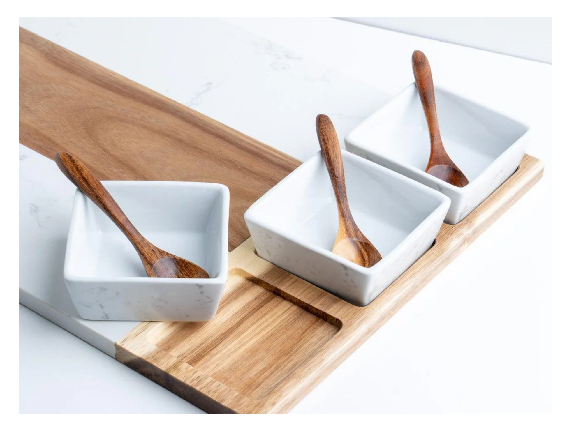 A beautiful marble charcuterie set complete with three dipping bowls and serving utensils. Perfect for hosting in a new home, this serving set becomes the centerpiece for gatherings with family and friends. Add personalization to create a gift that feels thoughtful and truly theirs.