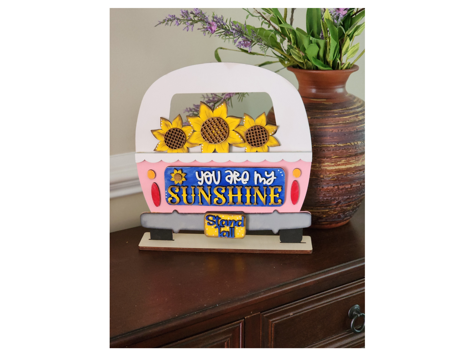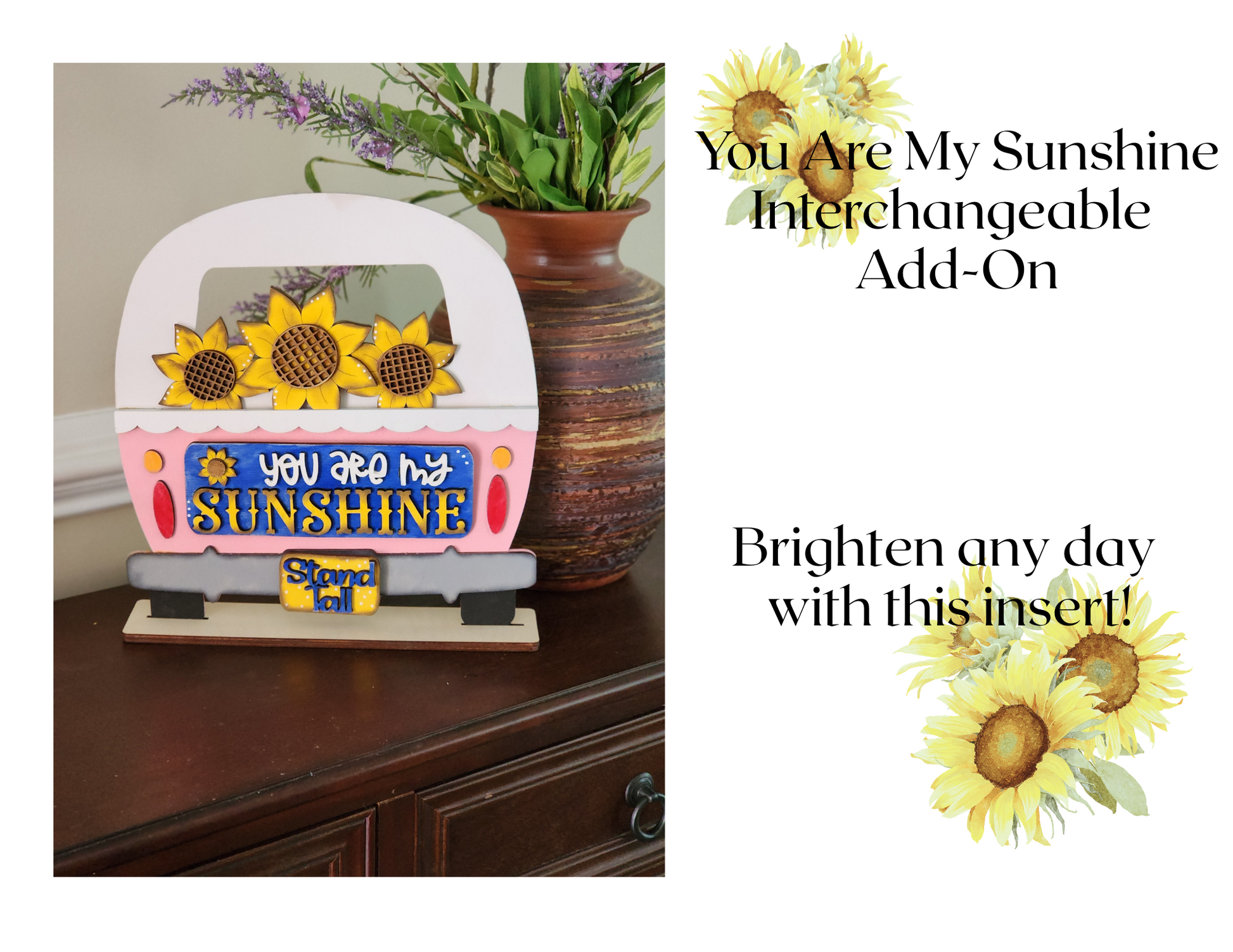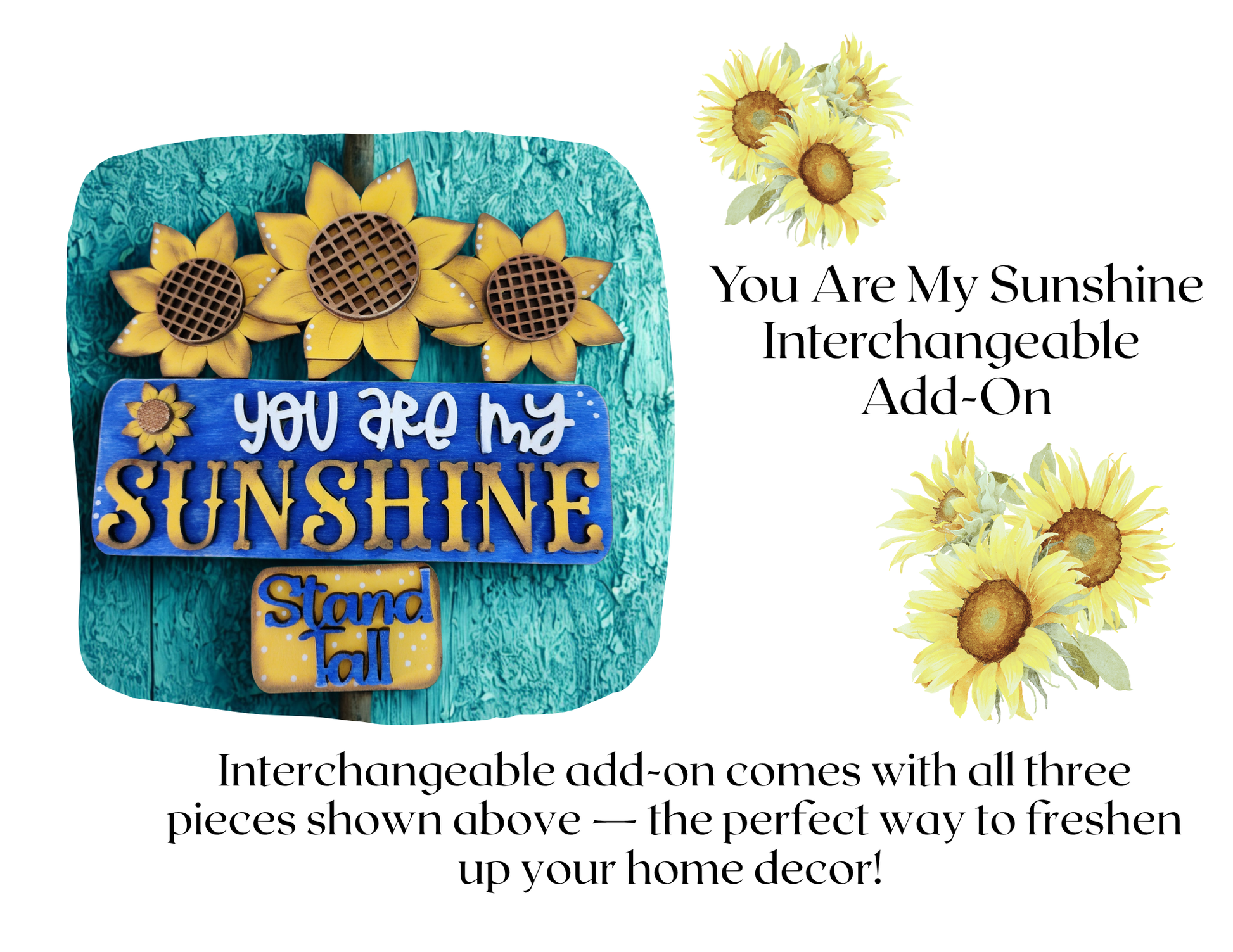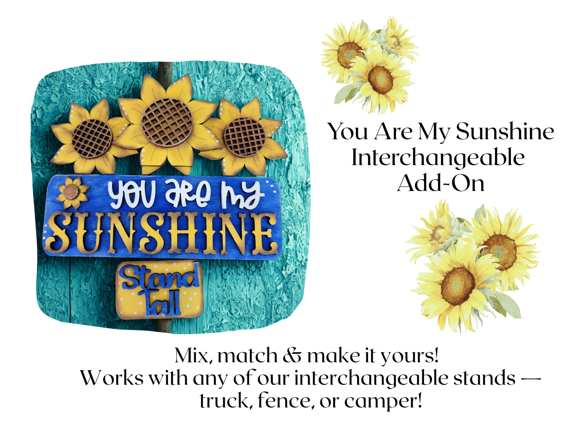 Brighten up your decor with this cheerful sunflower add-on! Designed to work perfectly with our interchangeable truck, fence, or camper (sold separately). This 3-piece set features the sweet message “You Are My Sunshine” painted in vibrant summer colors that brighten any room. Refresh your home decor in seconds with this happy sunflower set!